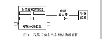 石英式動態(tài)地磅主要由石英稱重傳感器、電 荷放大器、稱重儀表、車輛分離裝置等組成。如圖1 所示。