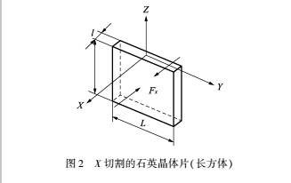 石英晶體的化學成分為SiO2,外形為六角棱 形;通常我們稱石英晶體的對稱軸為Z軸或光軸、 通過相對兩棱且與Z軸垂直的軸線為X軸或電軸、 與X軸和Z軸都垂直的軸線為Y軸或中性軸;X切 割的石英晶體片(長方體、圓柱體等)是指切割出來 的石英晶體片的兩個大面積的平面都與X軸相垂 直,如圖2所示。