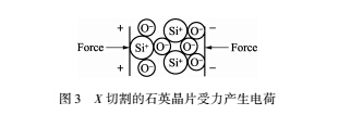 如圖3所示,當X切割的石英晶體片沿X軸方 向受一外力作用時,內(nèi)部產(chǎn)生極化,在垂直于X軸 的兩個平面上產(chǎn)生等量的正負電荷;當X切割的石 英晶體片沿Y軸或Z軸受一外力作用時,則不會在 垂直于X軸的兩個平面上產(chǎn)生電荷;這種現(xiàn)象被稱 為縱向壓電效應。