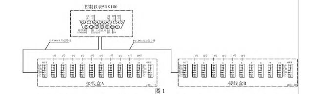 本臺地磅長度大,需用傳感器16只,一般的標準接線盒只能接10只傳感器,因此我們配了兩只接線盒,圖1中A接線盒接入10只稱重傳感器信號和B接線盒接入6只稱重傳感器信號由兩條信號線分別接入稱重控制器的傳感器接口。此接法在計量檢定時秤臺間有較大誤差。