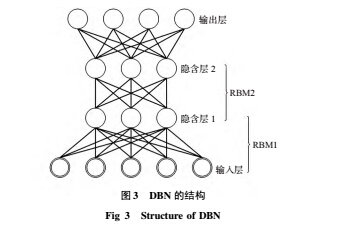 考慮到整車式地磅是由 16 只動態稱重傳感器構成,并且各個稱重傳感器狀態之間擁有固定的函數關系,所以,可以利用 DBN 來模擬各傳感器之間的關系。DBN 可以看作是帶有已訓練的初始權值的神經網絡,由若干個受限玻耳茲曼機( RBM) 組合而成的,圖 3 是由 2 個 RBM 構成的DBN,其下層的 RBM 的輸出層是上層 RBM 的輸入層。